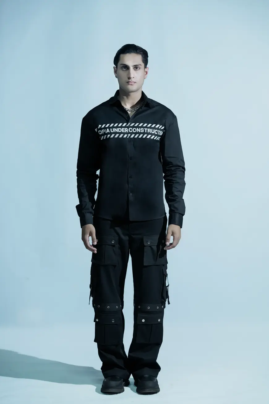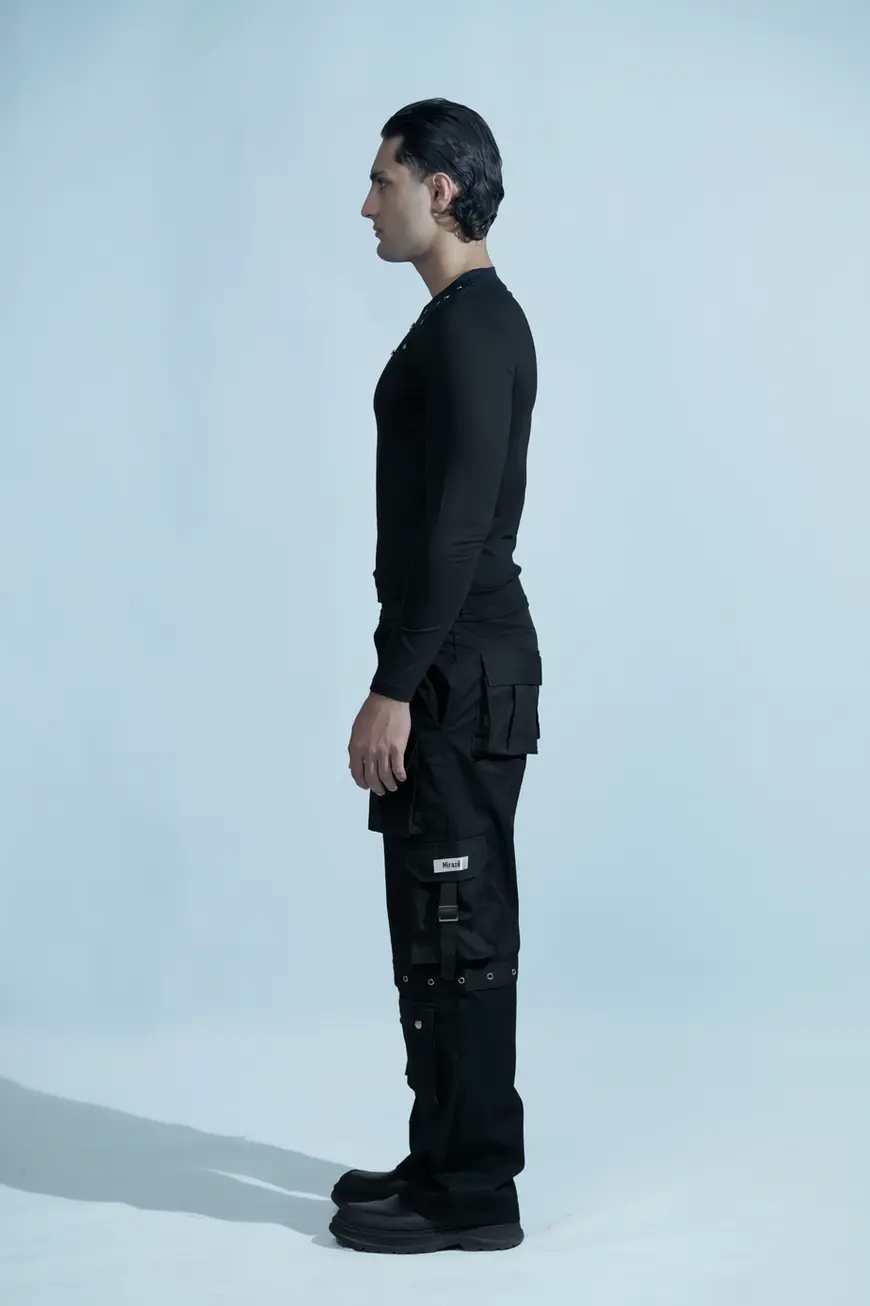 The not so typical cargo pants, featuring dual waist bands with button and loops, 10 pockets fit for both aesthetic and utilitarian purpose. This pair also consists of a knee band with eyelet details as a key design element. The use of nickel accessories contrasting with black twill fabric makes the pants eye-catching. The pants are longer than your typical pants.