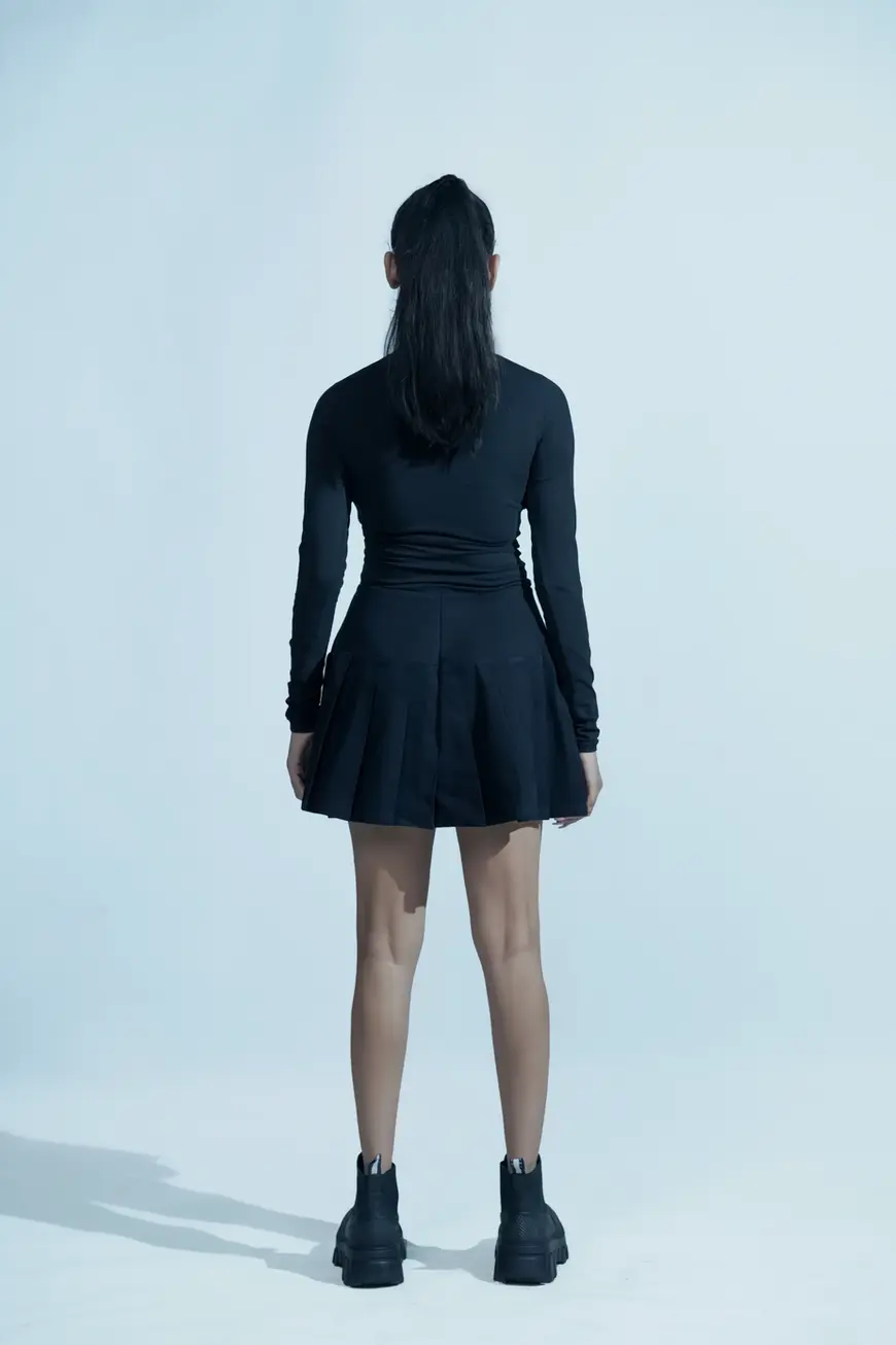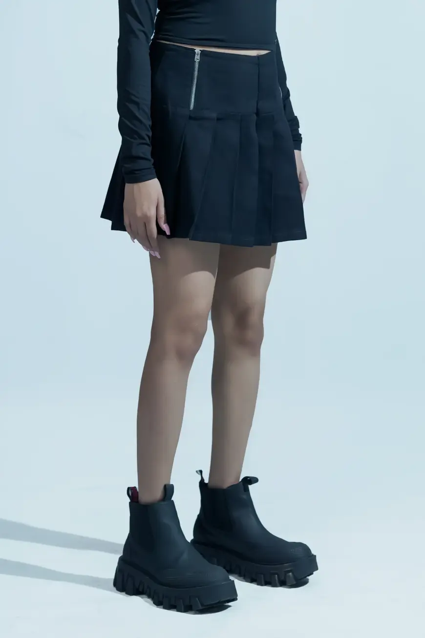 The skirt is a mini length yoke skirt with knife pleats. It features two slanted metal zippers to effectively fit at the waist. It is one of a kind piece having both calm and fun attributes.
